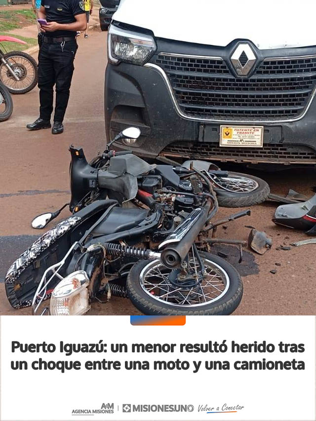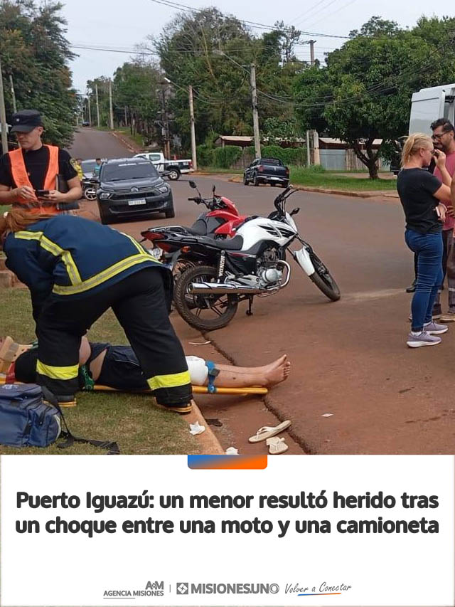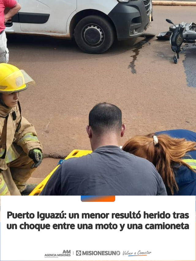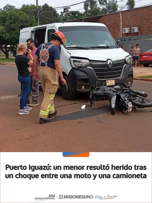 AGENCIA MISIONES.UNO | Un menor de edad resultó herido este lunes por la tarde tras un accidente de tránsito ocurrido en Puerto Iguazú. El hecho involucró a una motocicleta y una camioneta, y requirió la intervención de bomberos y personal de emergencias.