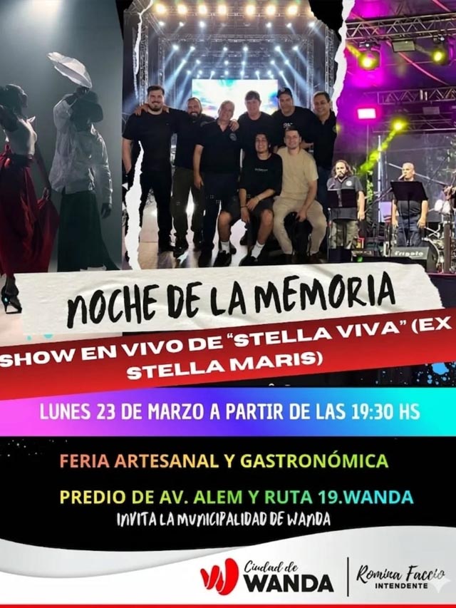 AGENCIA MISIONES.UNO | La Municipalidad de Wanda invita a la comunidad a participar de la Noche de la Memoria, un evento que se realizará el próximo 23 de marzo desde las 19:30, con propuestas artísticas y espacios de encuentro para vecinos y visitantes.